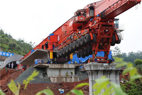 運架一體機(jī)自重高達(dá)672噸,工作載荷大,是目前較先進(jìn)的特重型起重設(shè)備,采用提梁、運梁、架設(shè)三合一模式設(shè)計;運架梁作業(yè)時,具有施工速度快,機(jī)動靈活,可以在隧道口和隧道內(nèi)零距離架梁,即便是橋隧橋相連的設(shè)計形式,即狐貍坑大橋+竹高嶺隧道+燕子巖特大橋這樣的設(shè)計形式,也無需拆解任何部件等優(yōu)點。
