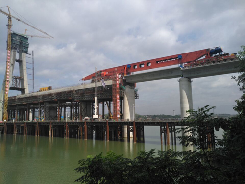中鐵二十一局路橋公司贛縣梁場負責昌贛客專12標段,線路全長45公里,需穿越26座隧道,共有531孔箱梁的制運架施工任務,針對管段橋隧相連的施工難題,中鐵二十一局采用了我公司的穿隧式運架一體機架設橋梁,大大節(jié)約了作業(yè)時間和人工成本。